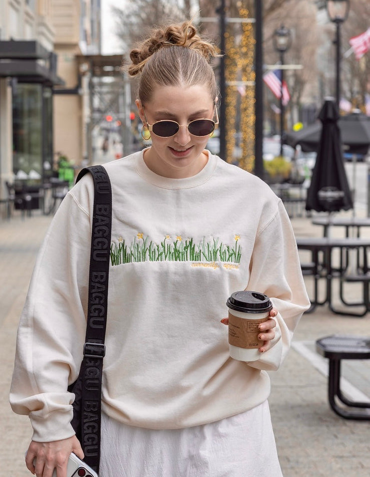 This sweatshirt features a green and yellow daffodil design embroidered across the chest on our classic, super-soft fleece crewneck.